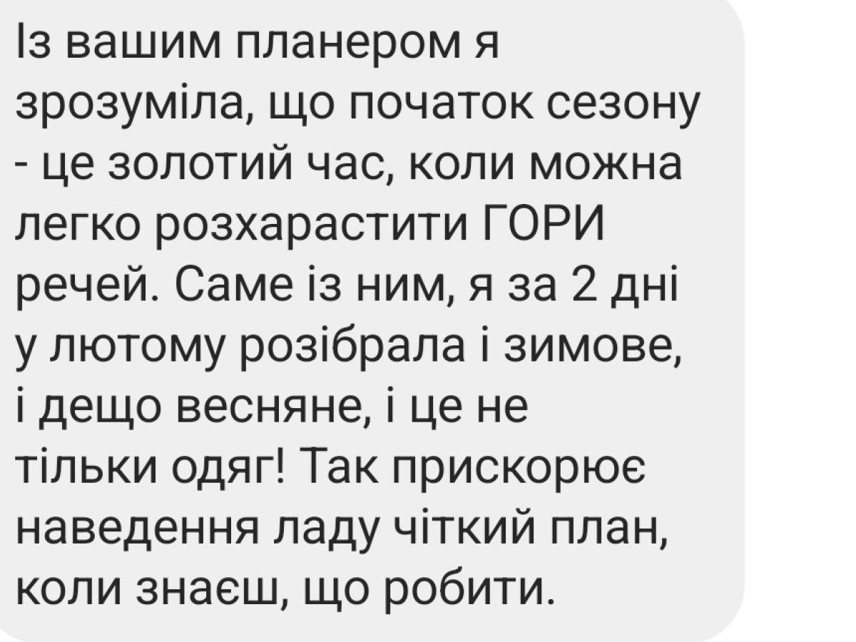 Його можна використовувати, якщо ви наводити порядок з нуля, або ж після розхаращення по проєкту "СтопМотлох". Планер дасть глибинний порядок, допоможе позбутися навіть того мотлоху, який раніше не був помітним. Саме за це читачі люблять його так само, як і я сама!