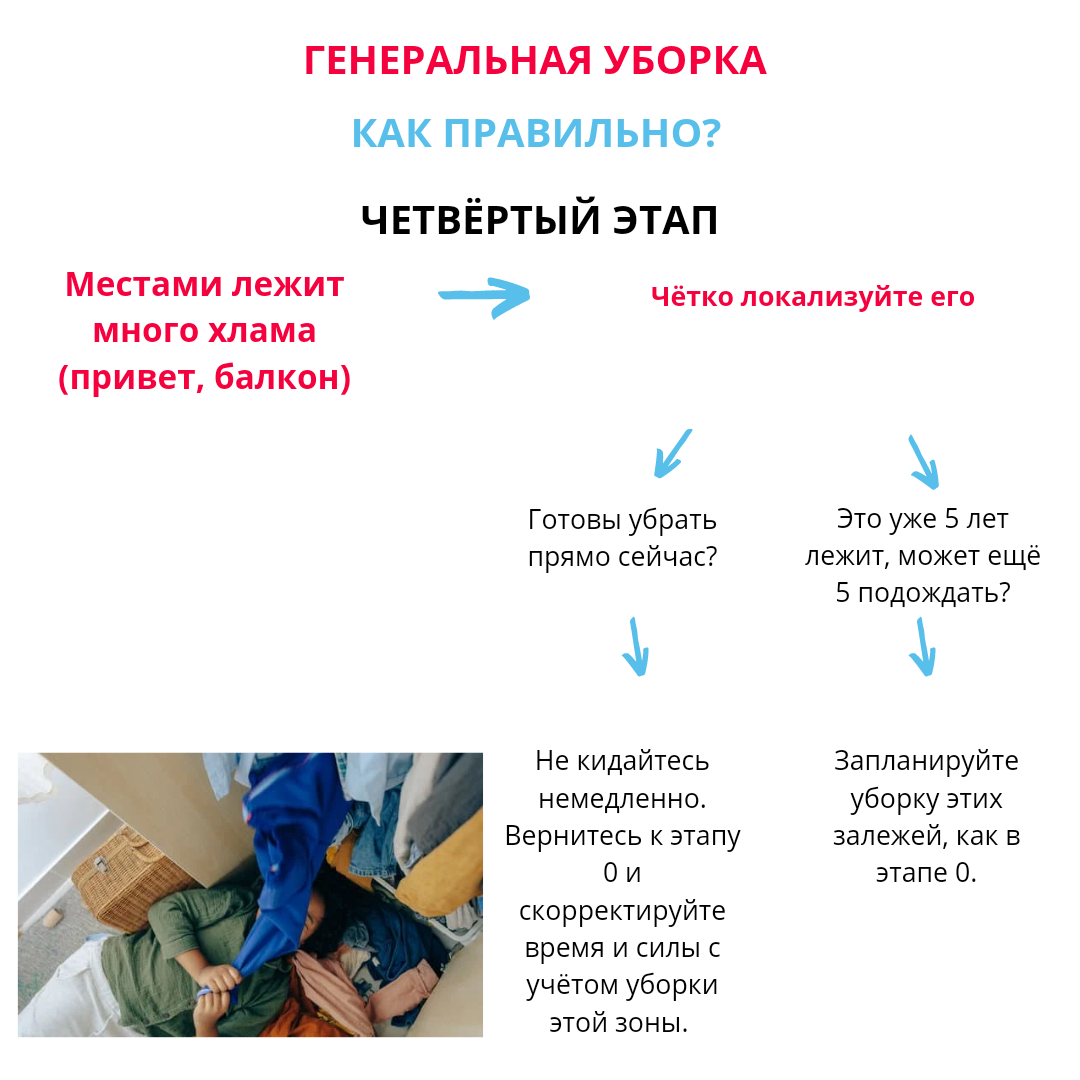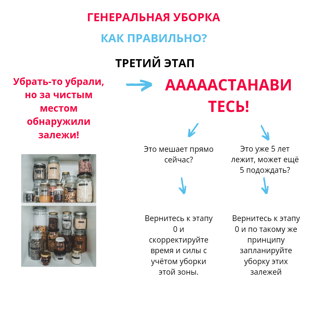 Этот этап придет тогда, когда захочется отступить от плана. Вы убирали, убирали... и вдруг нашли гору хлама. Конечно, есть искушение сразу ее разгрести. Но... не стоит!