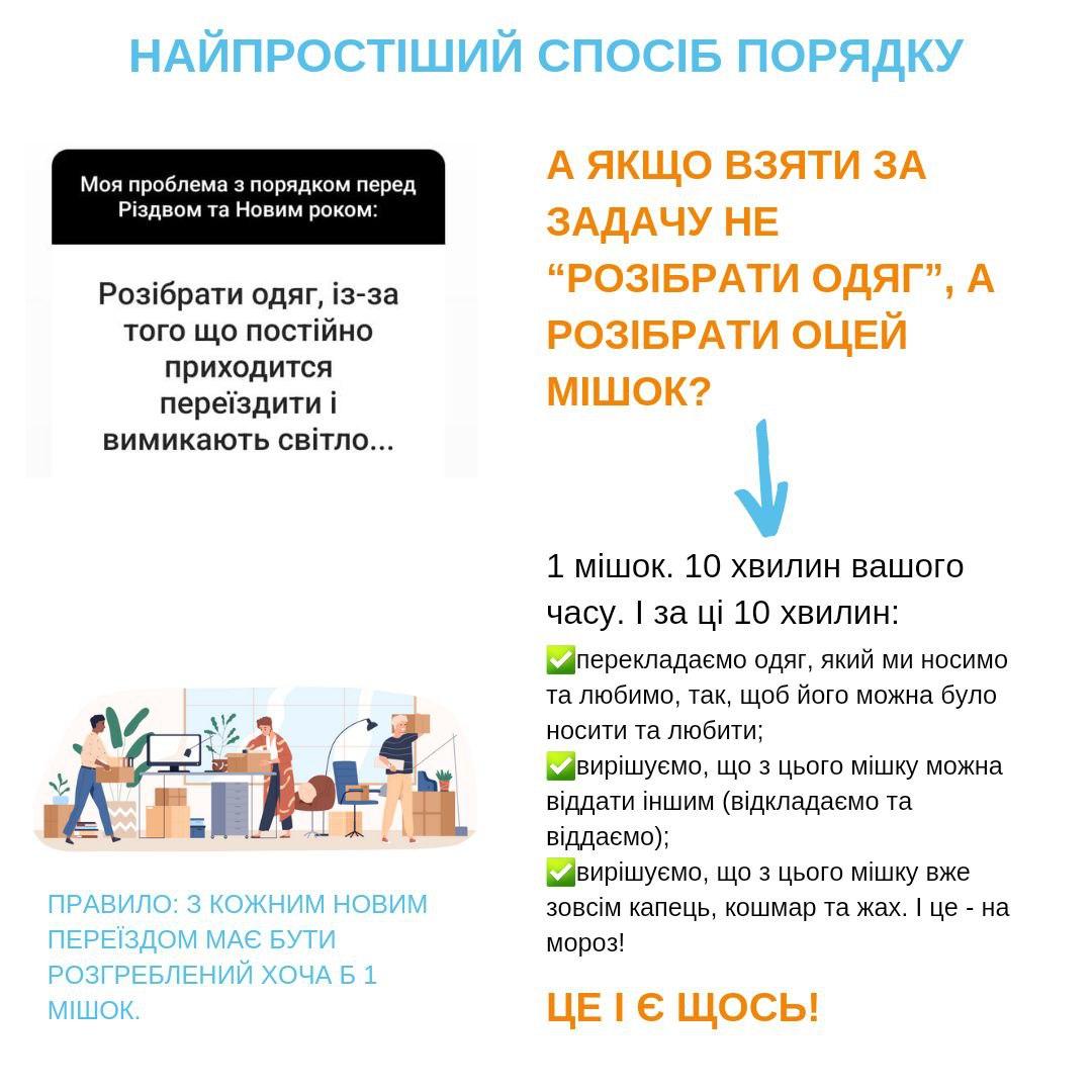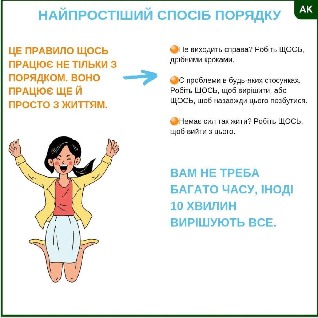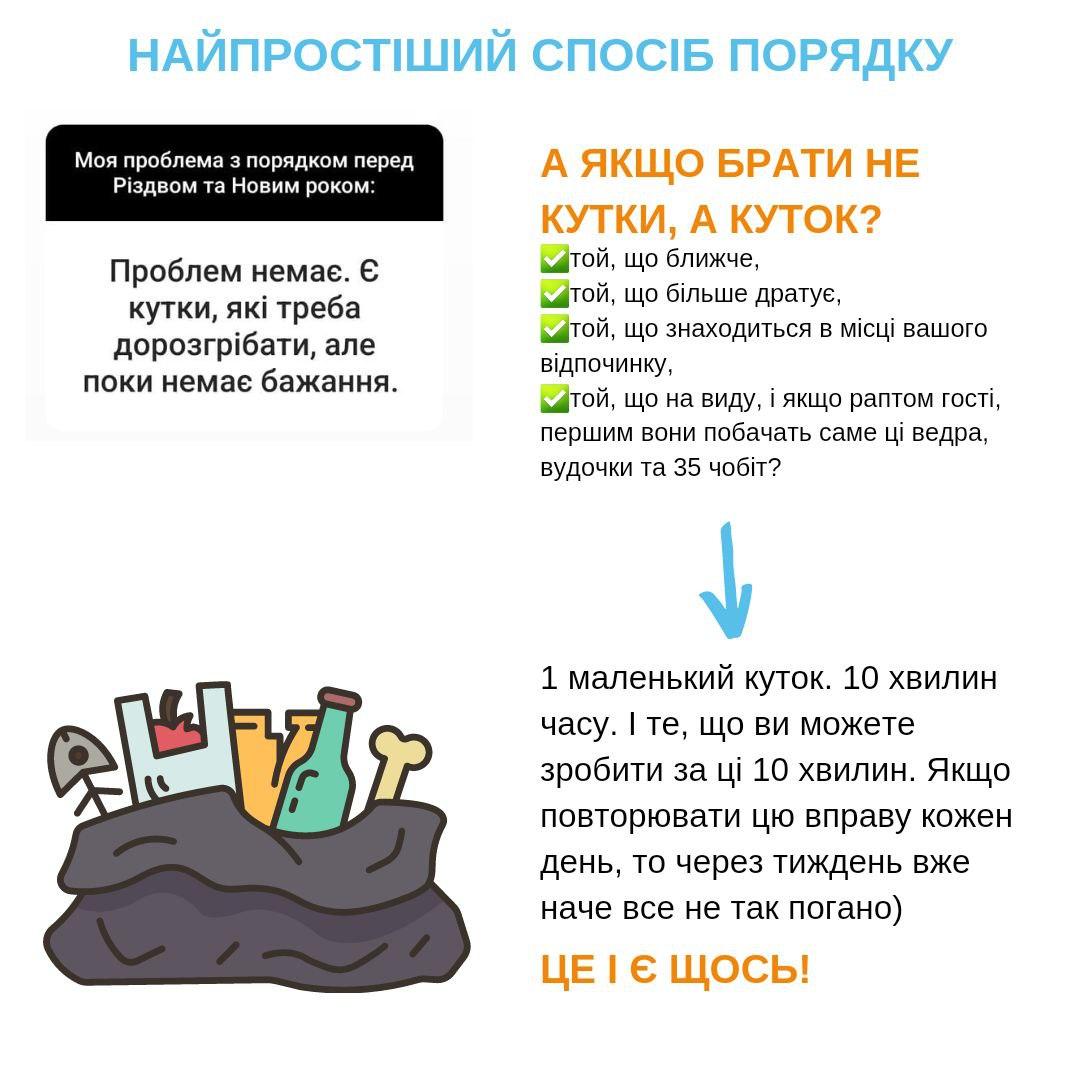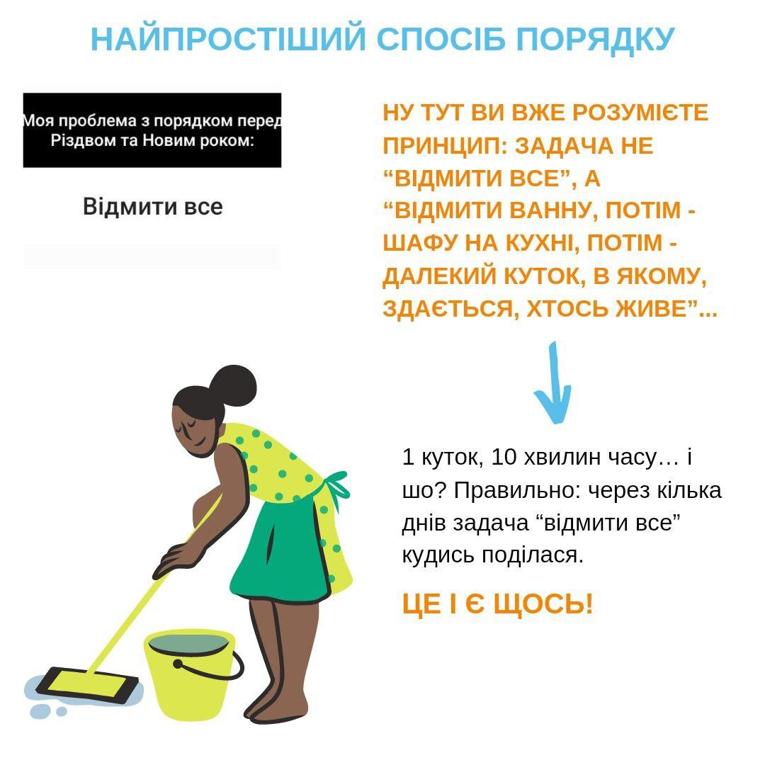- Немає “прибирання на цілий день”, “розхламлення від паркану до обіду”.