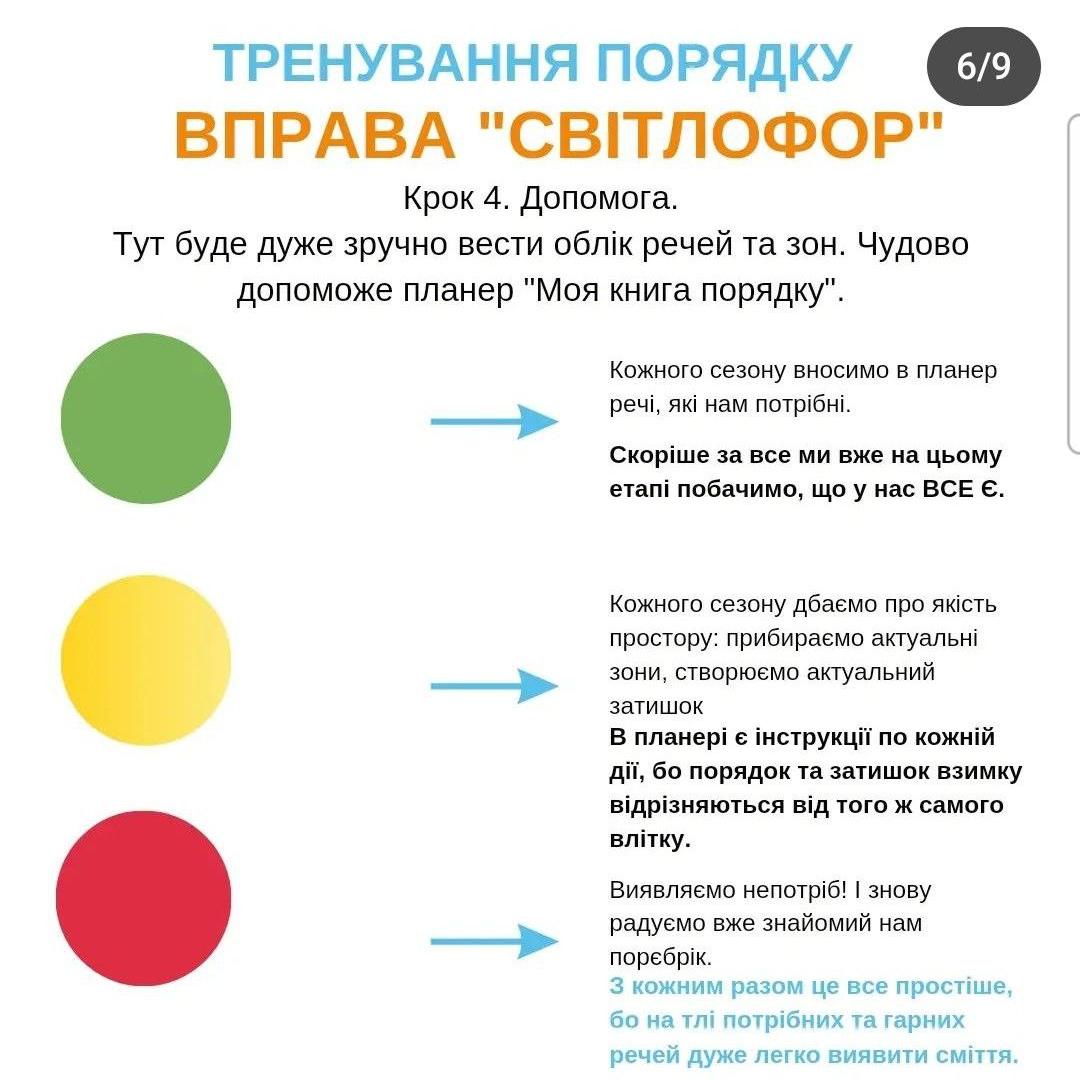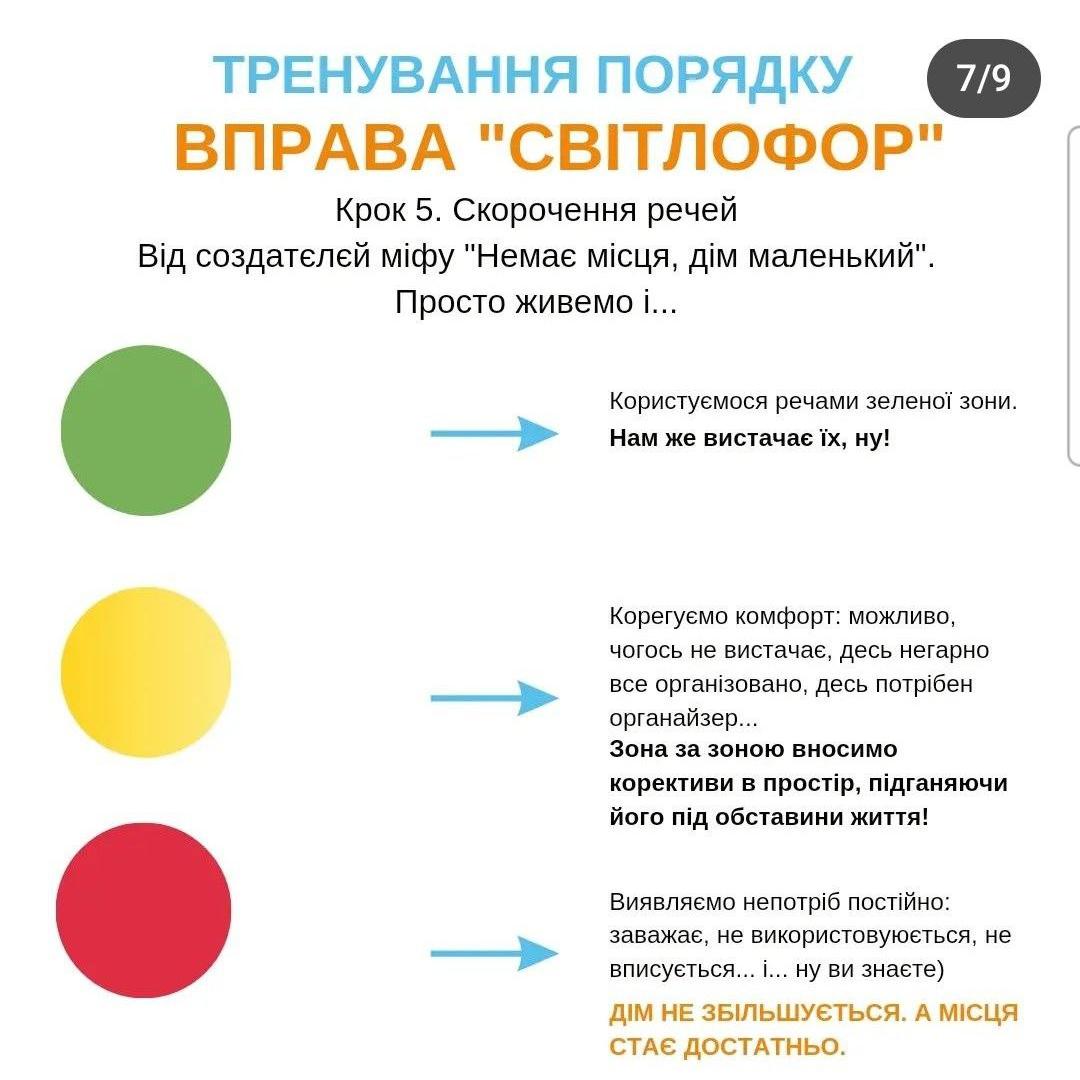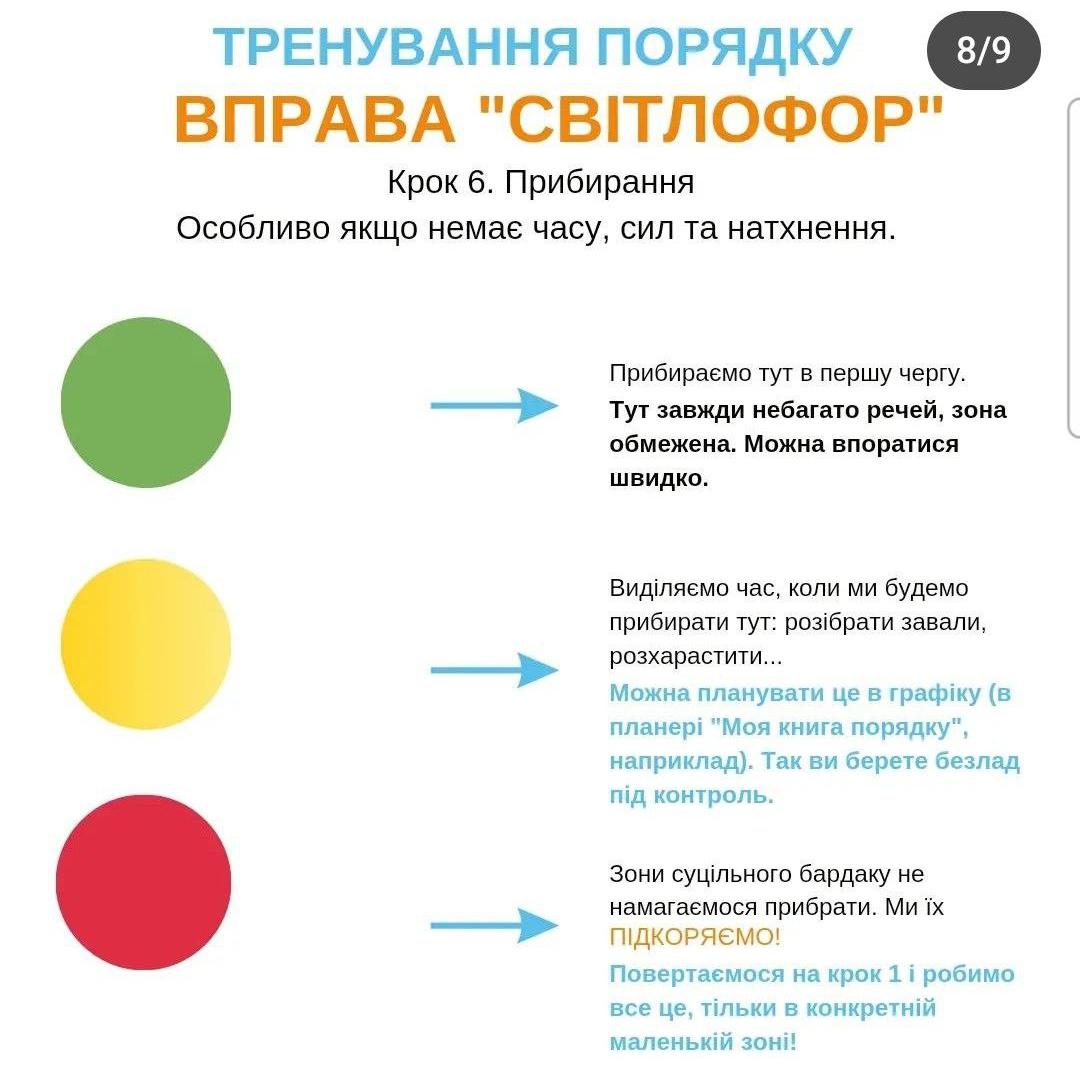 В ній всього три кольори та три кроки, і ті кроки періодично змінюються - ну точно, як у справжньому світлофорі. Саме це допоможе нам "накачати м’яз порядку", як сказала моя читачка Марина.