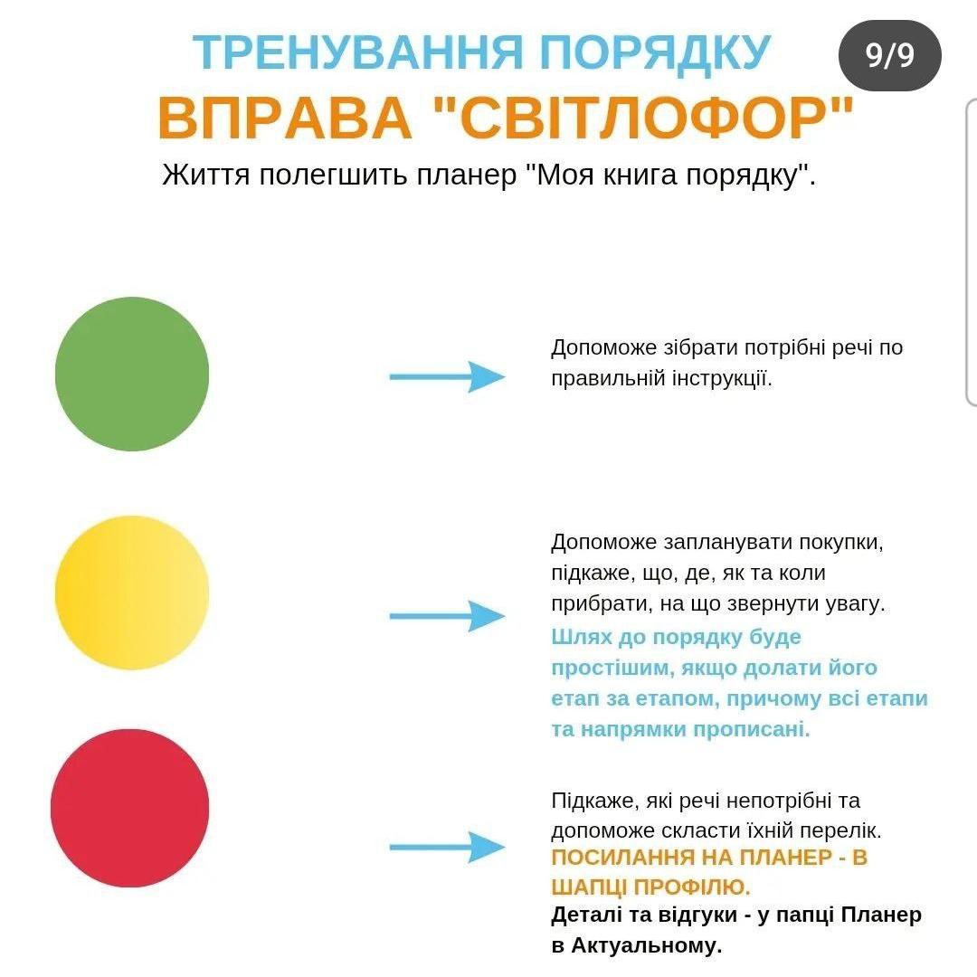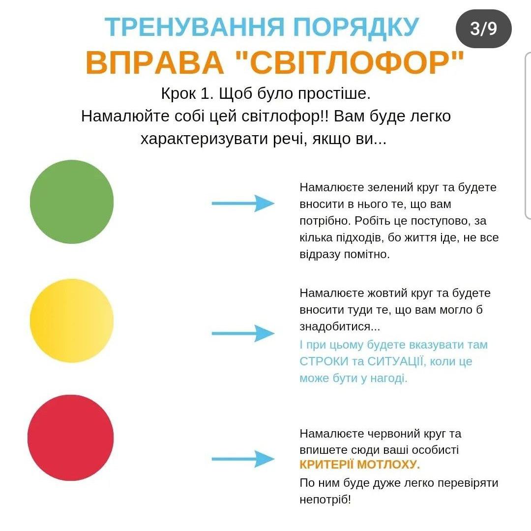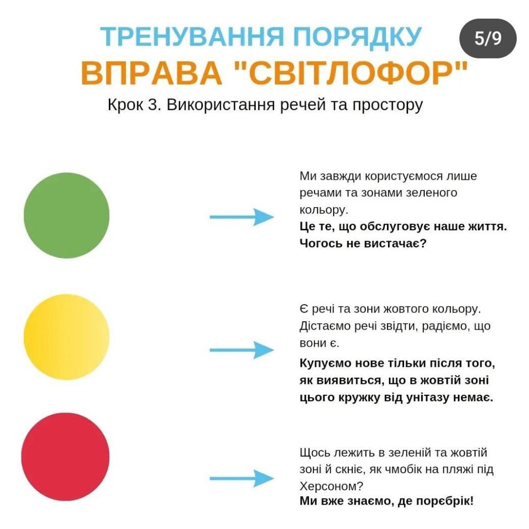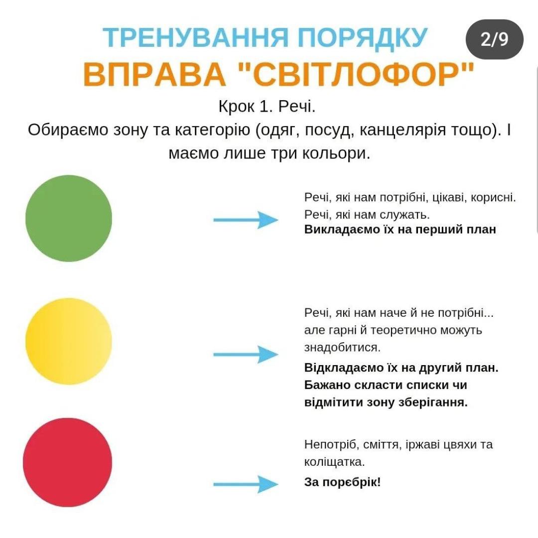 В ній всього три кольори та три кроки, і ті кроки періодично змінюються - ну точно, як у справжньому світлофорі. Саме це допоможе нам "накачати м’яз порядку", як сказала моя читачка Марина.