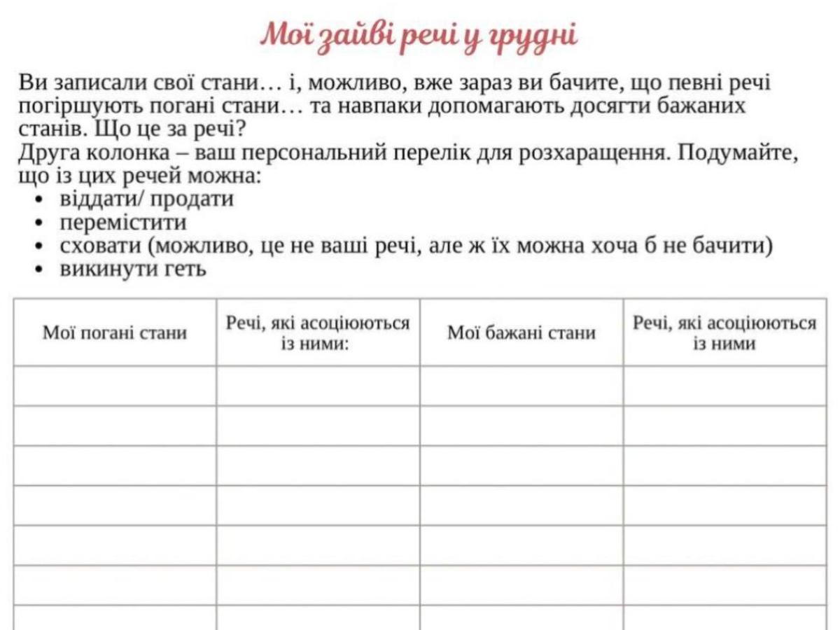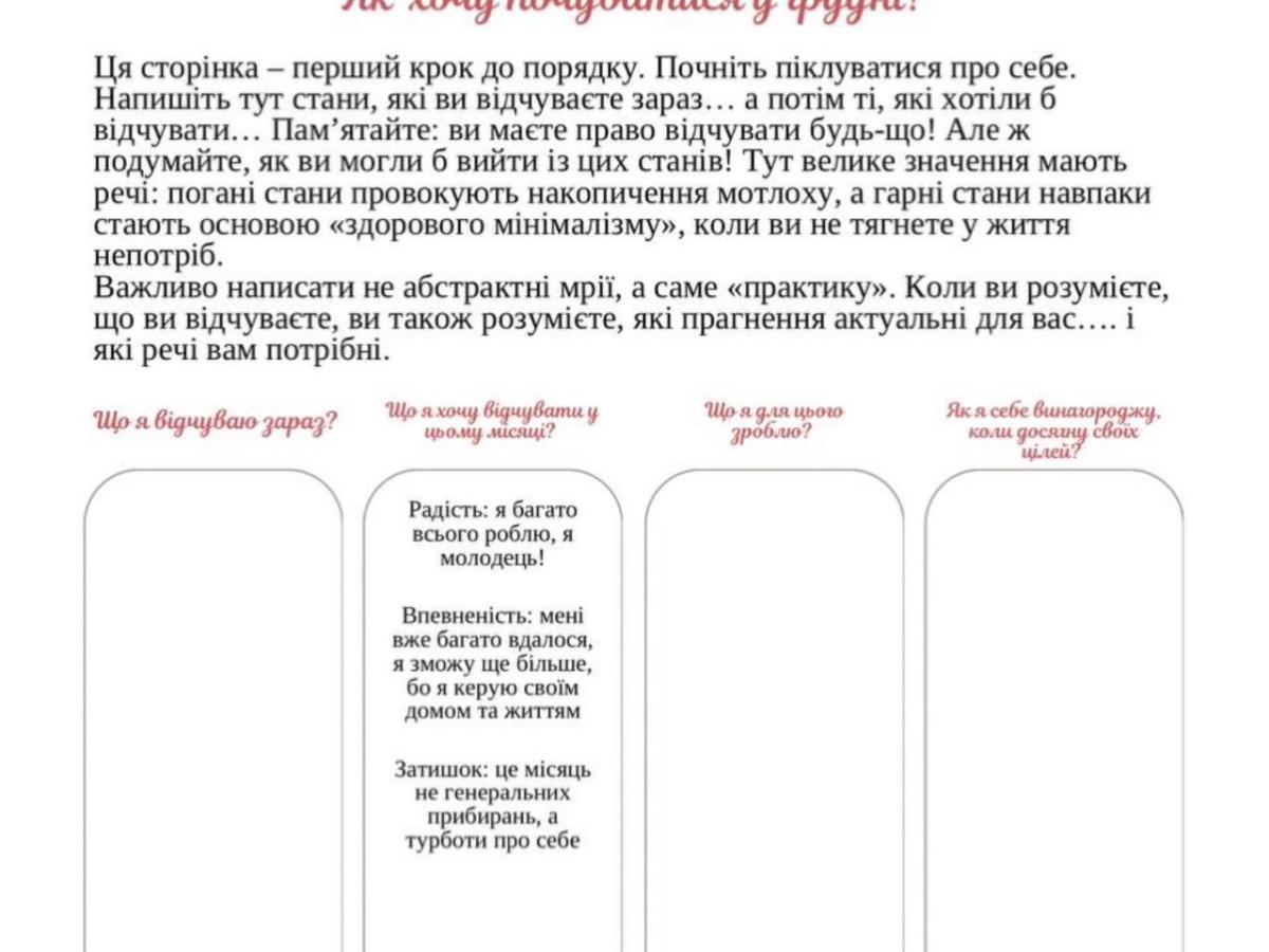 Цей лист народився після відгуків про мій планер "Порядок мого життя": там кожен місяць починається не зі списку справ, а із одного простого запитання: «Що я відчуваю зараз?». Тільки після цього запитання починається робота з простором і речами: не для ідеальної краси, а для того, щоб не погіршувати стан. Цією таблицею теж можете користуватися.