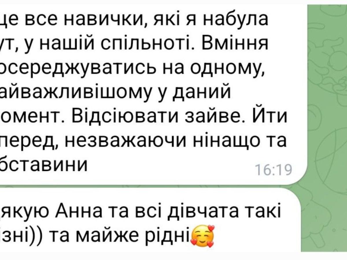- Постійна підтримка у чаті та можливість обсудити будь-які теми відкрито і з упевнененістю: тут мене зрозуміють.